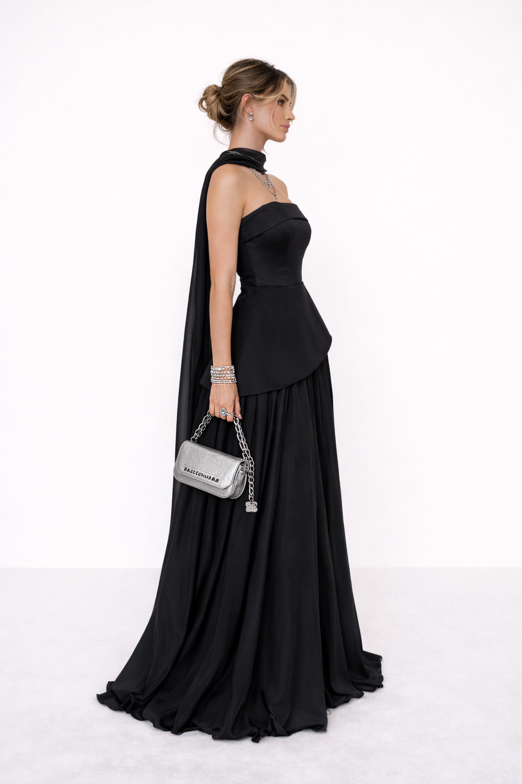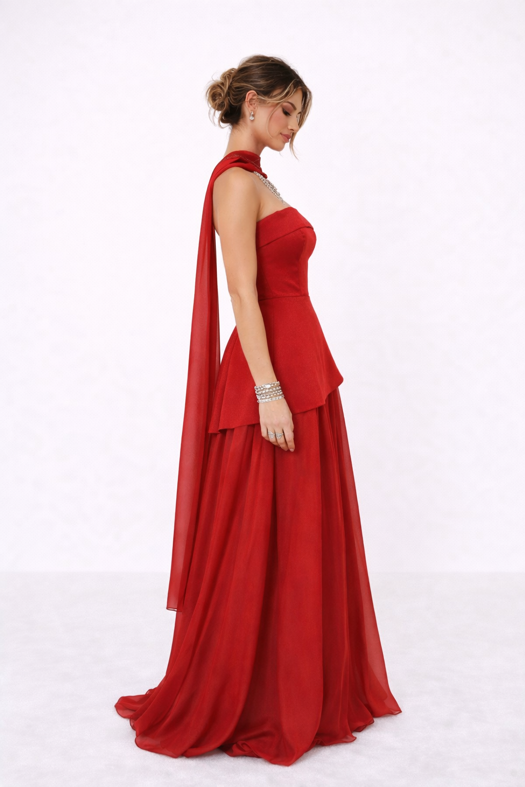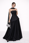 Strapless dress designed with a structured bodice that enhances the silhouette and a subtle peplum detail that defines the waist. The dress flows into a soft, fluid skirt, creating effortless movement and a balanced shape. Finished with a tie-back design at the back, allowing for an adjustable and personalised fit while adding a refined design detail.