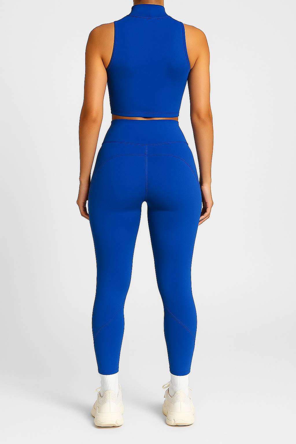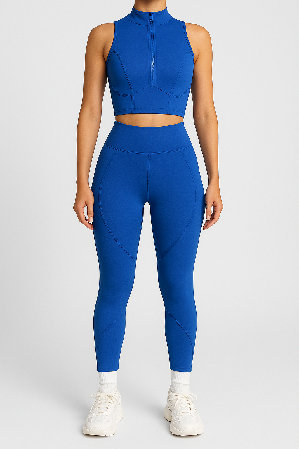 Turn heads at the gym or on the go with our Electric Blue PowerFit Co-ord Set. Crafted from a premium blend of nylon, polyester, and spandex (GSM 220), this set offers a perfect balance of stretch, durability, and breathability. The zip-up crop top ensures a supportive yet stylish fit, while the high-waisted leggings sculpt and contour your body with a second-skin feel.